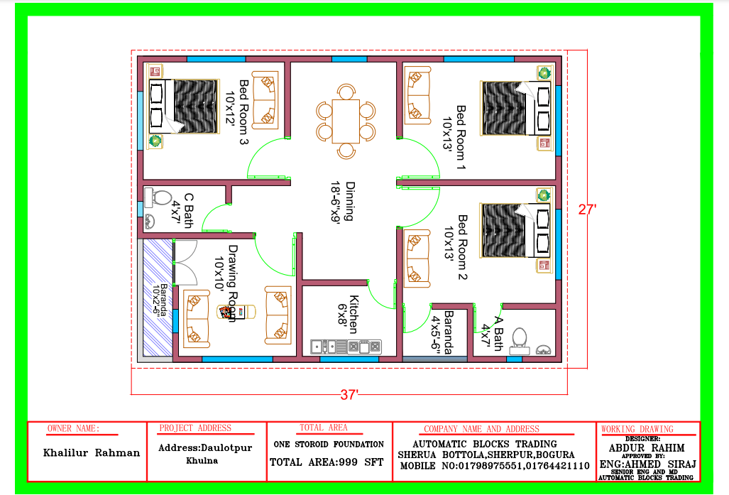 3 Bedroom, 3Bathroom, Drawing,Dining,Kitchen,Blcony and Porch